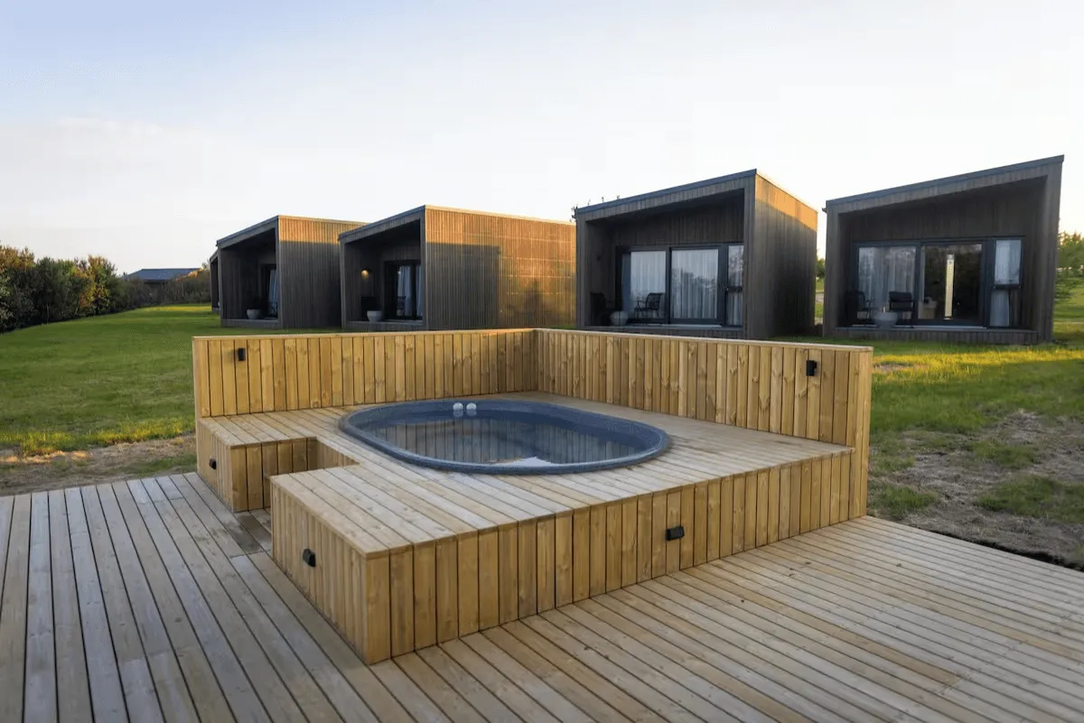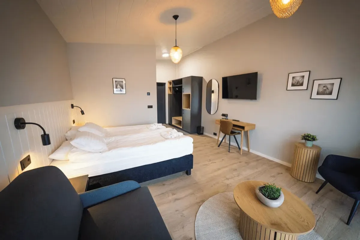 Spacious 35 m² standalone bungalow at Hotel Hamar featuring minimalist modern design with heated floors and a private patio. Includes 1 extra-large double bed and 1 sofa bed, accommodating up to 2 guests. Enjoy stunning mountain and garden views from your private balcony and terrace. The bungalow is fully equipped with sauna access, hot tub, coffee machine, flat-screen TV, soundproofing, free WiFi, and a luxurious ensuite bathroom with bath or shower. Additional amenities include refrigerator, electric kettle, hairdryer, and outdoor furniture.